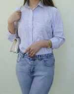 Because of its versatile design, this blue striped shirt pairs beautifully with denim for a casual look or with neutral-toned trousers for a chic office outfit. You can also tuck it into high-waisted pants for a polished finish. Additionally, its lightweight feel makes it perfect for year-round wear, whether layered under a blazer in cooler months or worn solo in warmer weather.