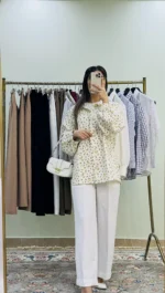 Styling possibilities are abundant. To illustrate, we love matching the shirt with our White High‑Waisted Pants, a neutral shoulder bag, and minimal gold jewelry. As a result, you achieve a balanced look where cozy texture meets clean tailoring. If you need added inspiration, see how we style this ensemble on our Instagram reels, where soft waves, pointed‑toe flats, and subtle accessories complete the vibe.